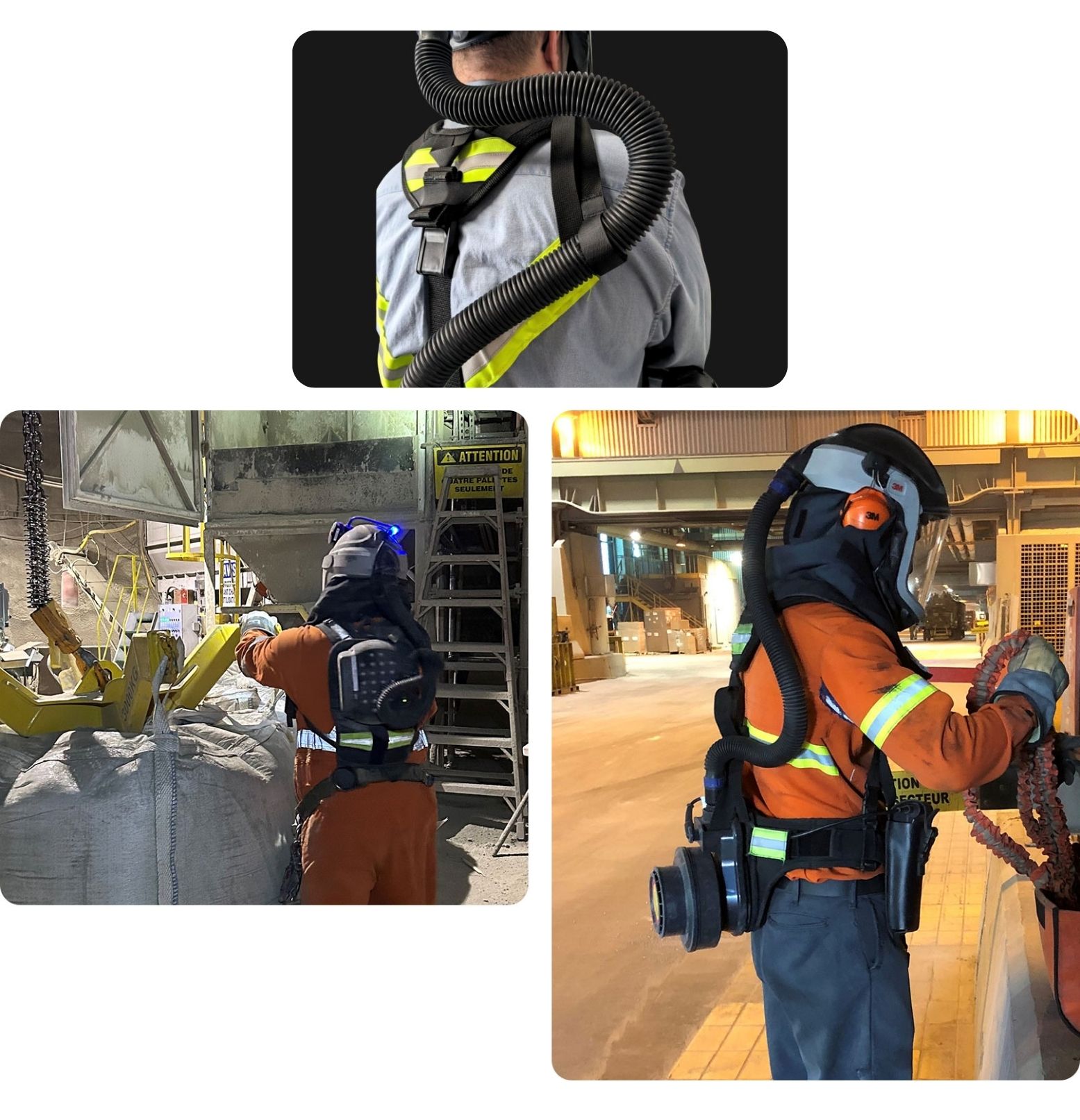 Nos attelages ont tous fait leurs preuves dans l’industrie et sont approuvés par les comités de Santé et Sécurité au Travail. Ils ont été développés dans le but de répondre aux réels besoins des travailleurs et d’optimiser l’utilisation des PAPR.